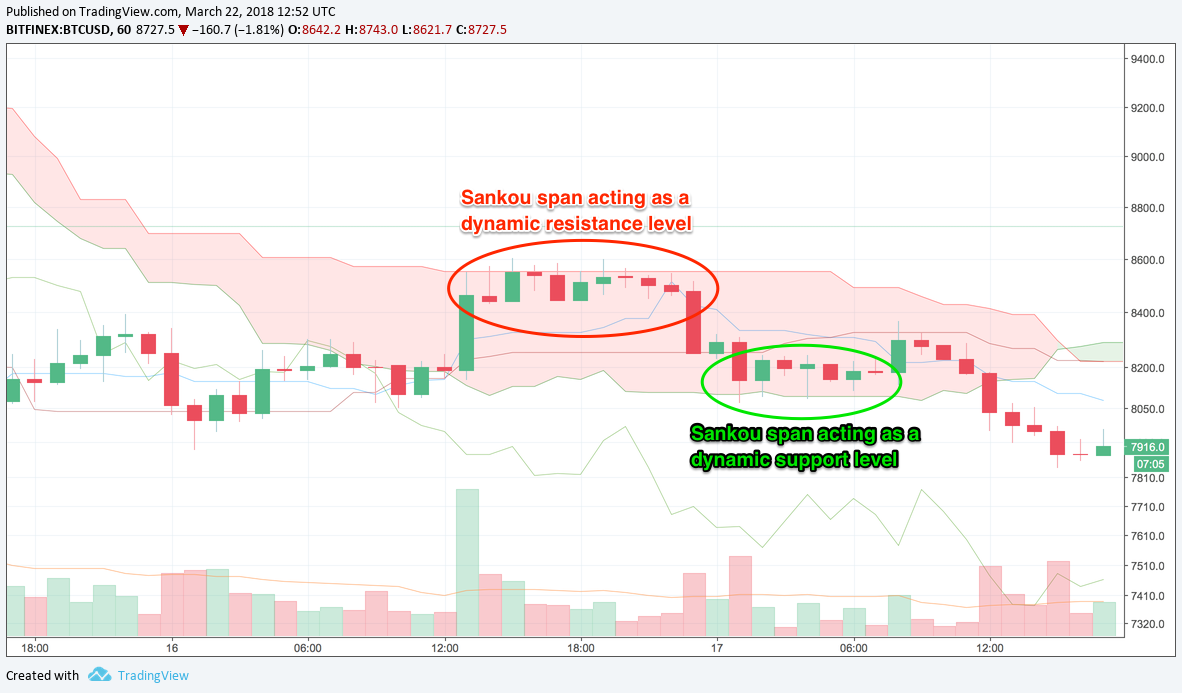 » Price below Senkou span = bottom line acts as the first resistance and the top line as the second resistance.
